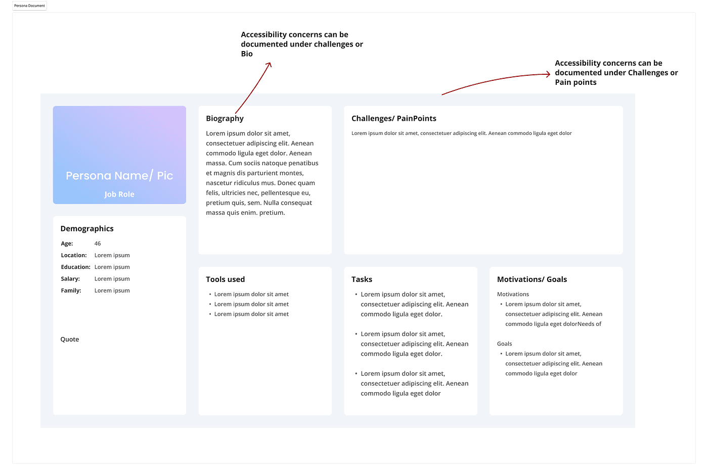 A sample persona layout that highlights where to record accessibility needs within the Biography or Challenges / Pain Points.