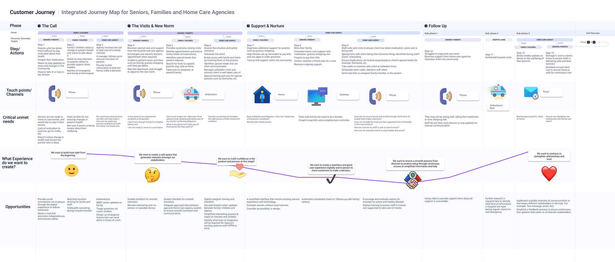 Strategic Mapping: We developed individual customer journey maps for all key personas (Seniors, Family, Home Care Agency). Crucially, we consolidated these into a single Integrated Journey Map that served as a holistic, 360-degree strategic blueprint, directly informing the product strategy.